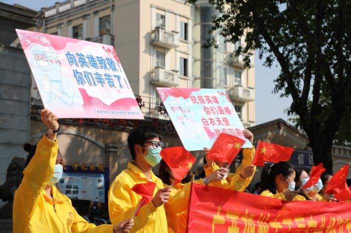 自新冠肺炎疫情發(fā)生以來(lái),賀州市共派出33名醫(yī)護(hù)骨干和1名防疫專家緊急馳援湖北開(kāi)展醫(yī)療救治工作。他們帶著賀州市委、市政府的囑托和關(guān)懷,帶著家鄉(xiāng)246萬(wàn)人民的牽掛和關(guān)心,義無(wú)反顧投身抗擊疫情第一線。他們以信心、勇氣和醫(yī)技為疫區(qū)群眾筑起了堅(jiān)強(qiáng)的健康長(zhǎng)城,不負(fù)黨和人民托付,彰顯了敬佑生命、救死扶傷、甘于奉獻(xiàn)、大愛(ài)無(wú)疆的崇高精神,詮釋了醫(yī)護(hù)工作者的初心使命,充分展現(xiàn)了新時(shí)代賀州人民的責(zé)任擔(dān)當(dāng)和精神風(fēng)貌。