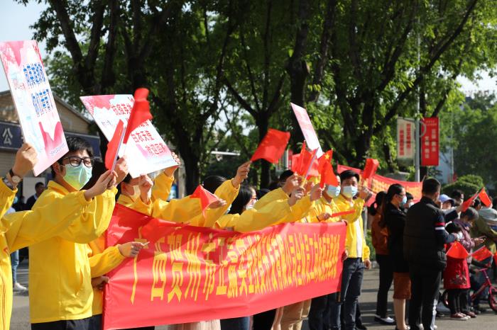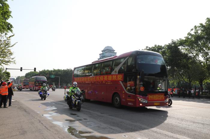 下午16點(diǎn)整,載著賀州支援湖北醫(yī)療隊(duì)的大巴車在33輛摩托車鐵騎、兩輛警車的引導(dǎo)護(hù)航下駛?cè)胭R州大道,警燈閃爍、警笛嘹亮,沿途市民揮舞國(guó)旗,夾道歡迎,高聲歡呼,壽城人民用最高禮遇,最深敬意,迎接英雄凱旋,表達(dá)對(duì)英雄的敬意。