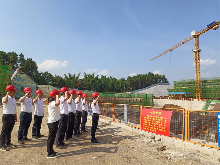 “我志愿加入中國共產(chǎn)黨,擁護黨的綱領(lǐng),遵守黨的章程,履行黨員義務(wù),執(zhí)行黨的決定……”項目建設(shè)施工現(xiàn)場,黨員們面對莊嚴的黨旗,重溫了入黨誓詞。