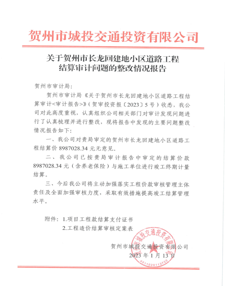 上一篇:城投公司關于市容市貌綜合提質三年行動實施方案建設項目(2)標審計問題整改情況報告